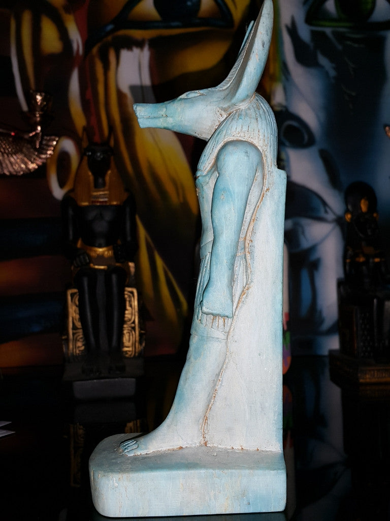 Museum quality reproduction of a fiance Anubis 22.5cm tall. This is a beautiful collectors piece. Made by genuine Egyptian Artisans.